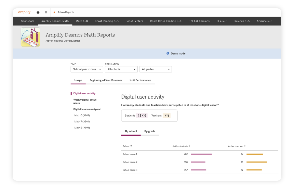Amplify Desmos Math provides a complete picture of student, class, and district performance, allowing administrators to implement instructional and intervention plans.