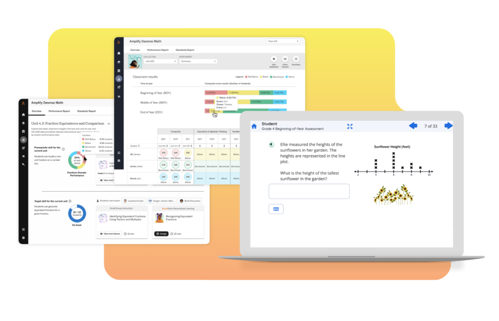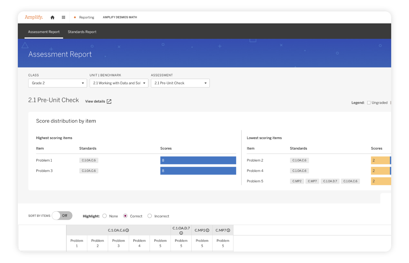 Amplify Desmos Math provides teachers and administrators with unified reporting and insights so that educators have visibility into what students know about grade-level math—and can plan instruction accordingly for the whole class, small groups, and individual students. View an overview of the Amplify Desmos Math reporting suite.